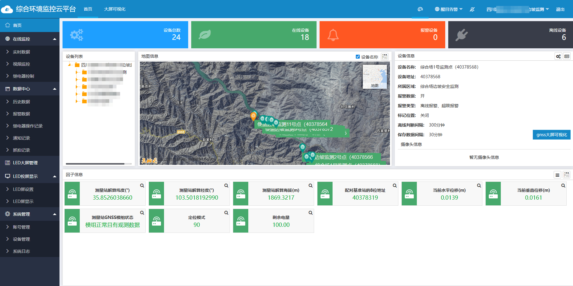 2.环境监控云平台:作为系统的“大脑",承担数据接收、解算、分析、预警和管理等多项功能。可实时接收监测站通过4G网络上传的位移数据,通过专业算法完成数据解算,生成直观的位移变化曲线和监测报告;支持多终端查看,管理人员可通过电脑、手机随时随地掌握边坡动态,当监测数据超出安全阈值时,系统自动发出预警,实现远程管控、快速响应。