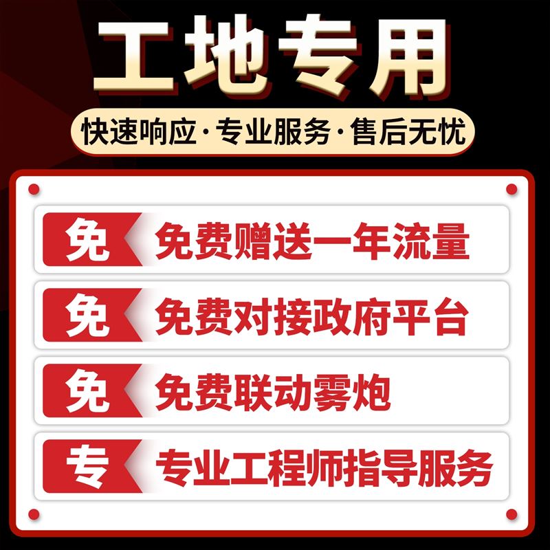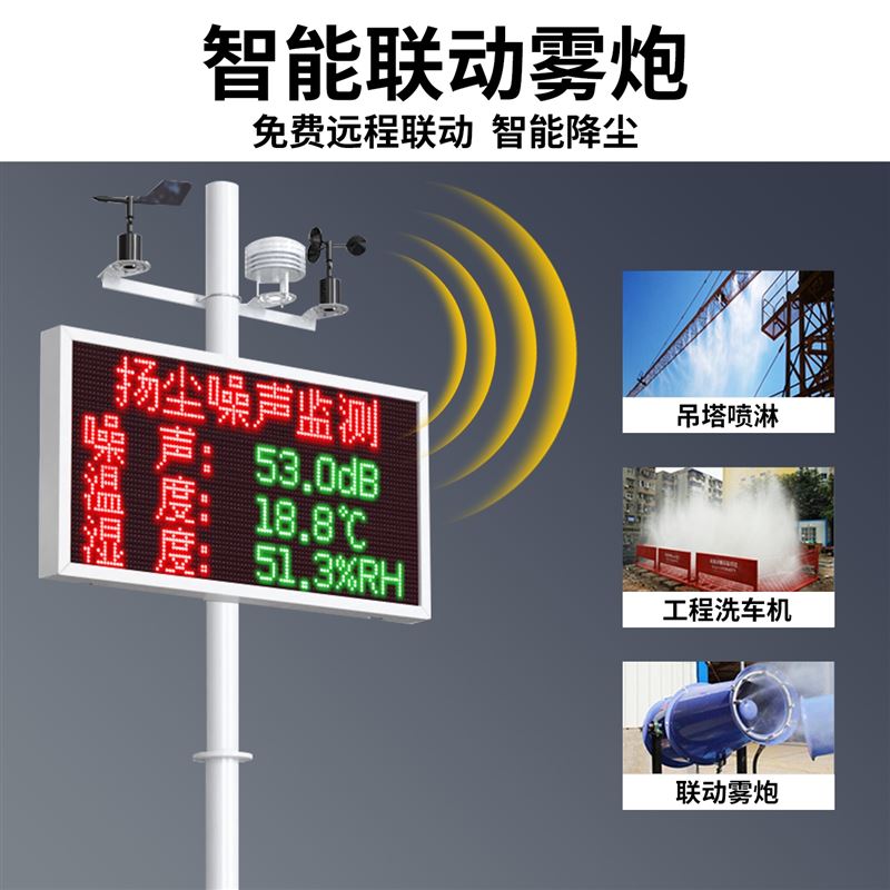扬尘监测站是专门针对在建工程项目的监测设备。该设备具有1 路百叶盒(温度、湿度、噪声、PM2.5、PM10、气压、TSP)采集、1 路风速采集、1 路风向采集、1 继电器输出(默认可接现场二级继电器控制雾炮);该设备可通过 4G 方式将数据上传监控软件平台,同时该主机能够外接 1 路 LED 屏(54cm*102cm)实时显示当前数值信息。
