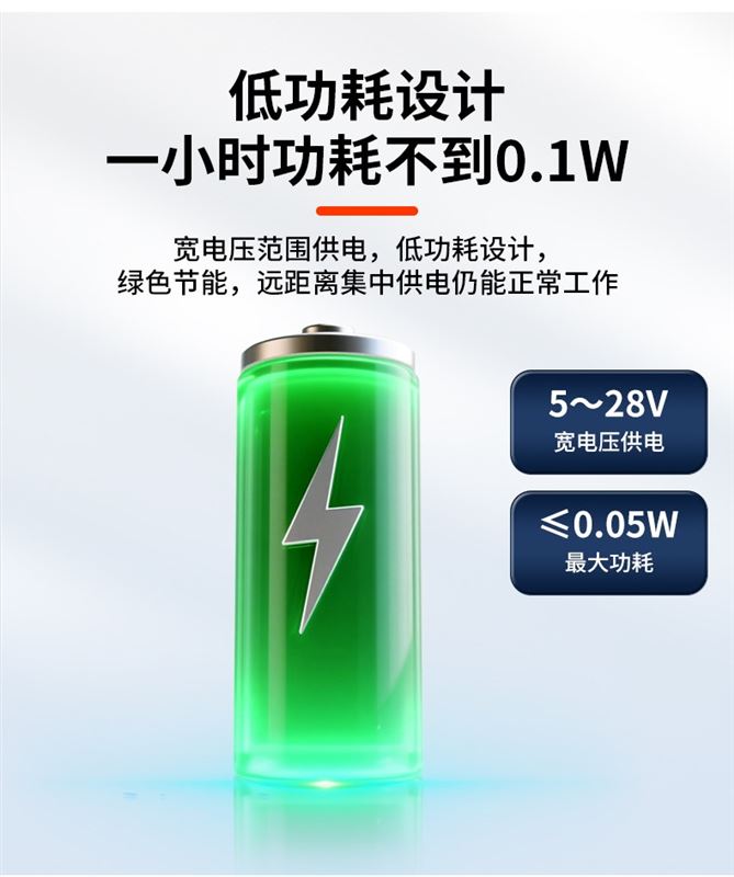5~28V 宽电压范围供电,远距离集中供电仍能正常工作;