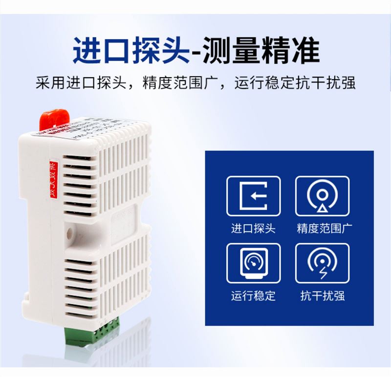 该变送器温湿度传感器及大气压力传感器内置,体积小巧,具有标准 DIN35 导轨安装卡,可直接用于导轨安装。该产品广泛适用于配电柜安装,也可壁挂安装,485 通信接口标准 ModBus-RTU 通信协议,通信地址及波特率可设置,通信距离最远 2000 米。